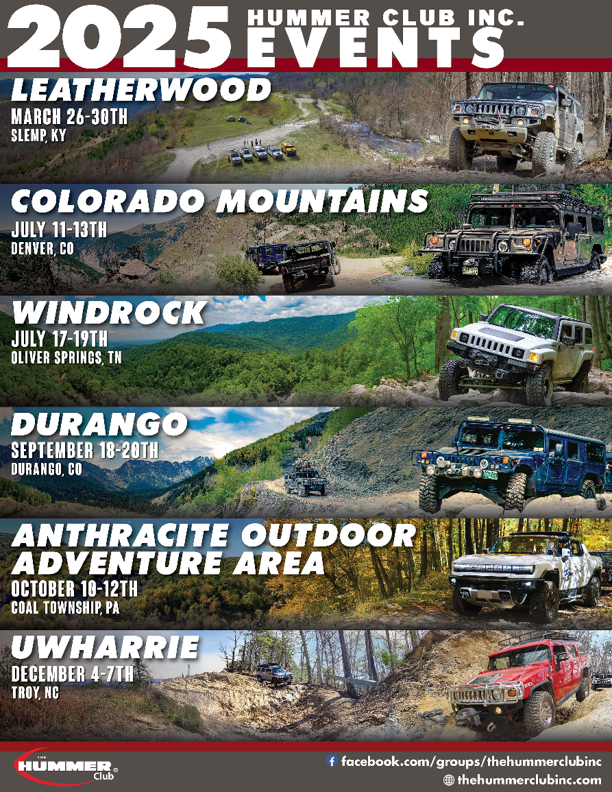 The Hummer Club Inc recently posted their schedule of 2025 events. I've never been, but two of them (Colorado Mountains and Durango) are within a day's drive for me, so ...
