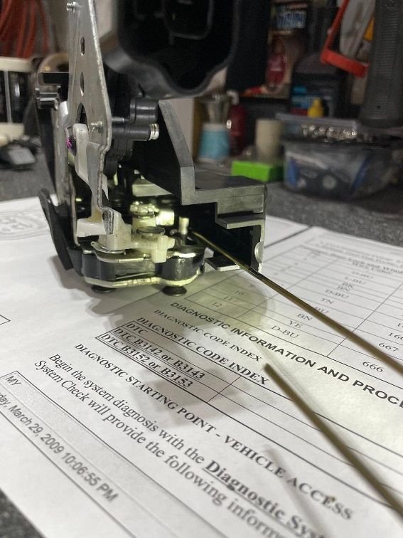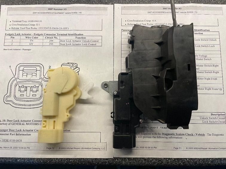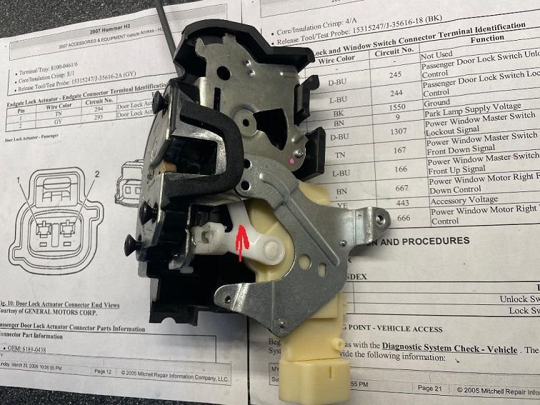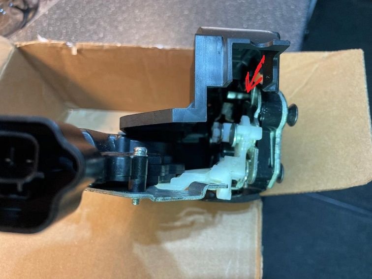 Here is my latch actuator with the old dead power lock mech (black) in position with the new replacement (white) to the side, Two screws hold them in place, easy swap.