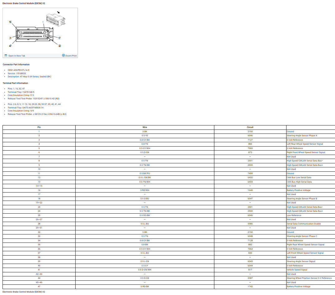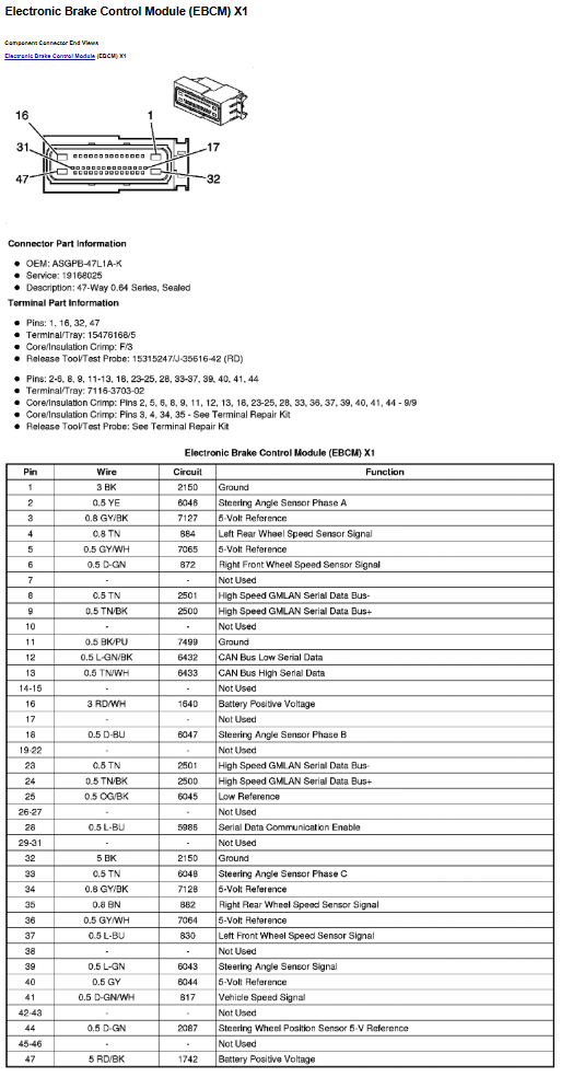 I have a very important update that everyone(especially me) will be very pleased about. I have confirmed that an abs pump and ebcm from a 2008 Cadillac Escalade(P/N 15834127) is a direct fit to the 2008 hummer h2. And by "direct fit" I mean not at all, BUT the electronics with little effort other than changing the connector. I didn't even have to program it, and all of the modules in the vehicle are happy. No codes from anywhere. Only codes I have are 6 codes all for sensors not being hooked up. It was as simple as matching colors. Minimum required was the two powers and grounds, 4 hi spd data lines, and the serial data enable wire. Here are the confirmed correct pinouts for each module. They are oriented looking at the front of the connector on the harness side. Be careful as orientation is quite confusing on these.