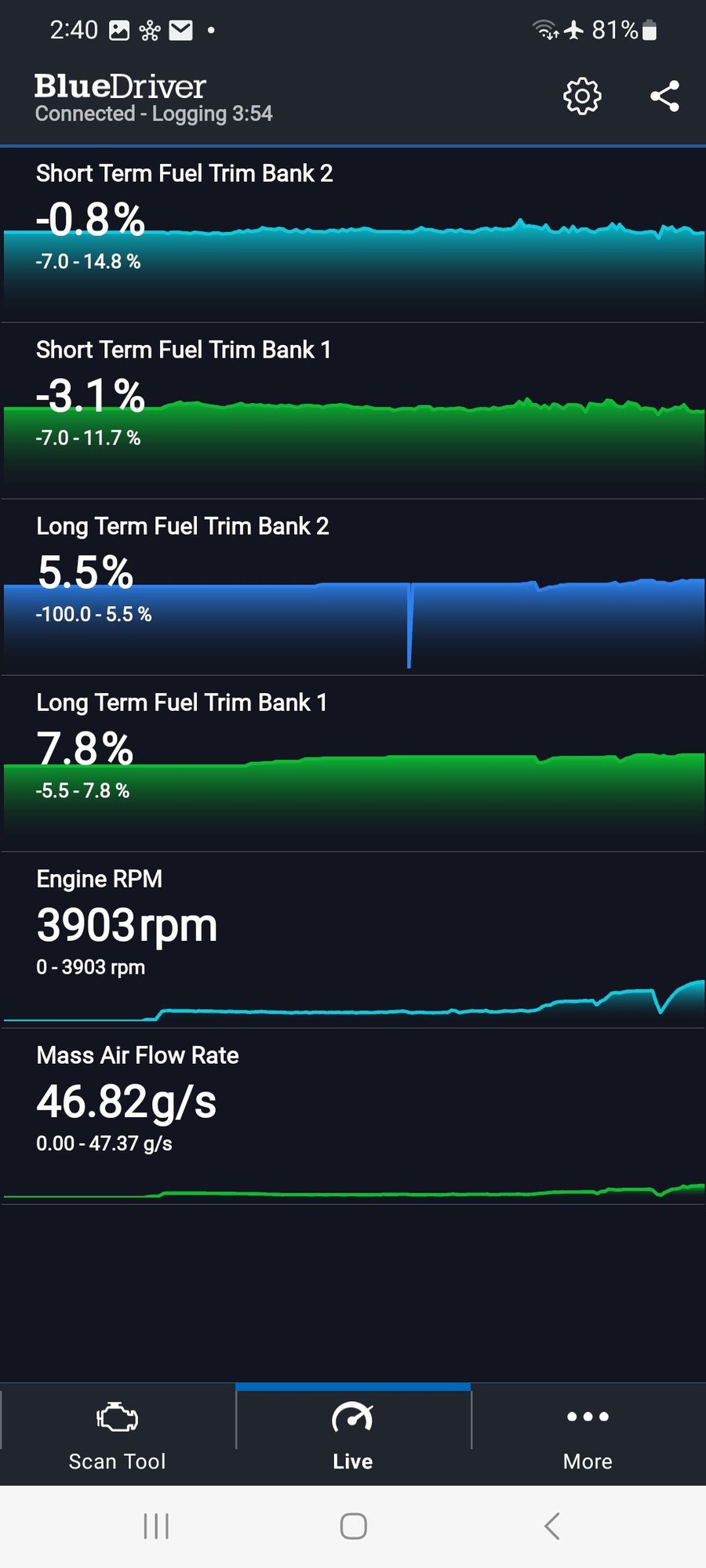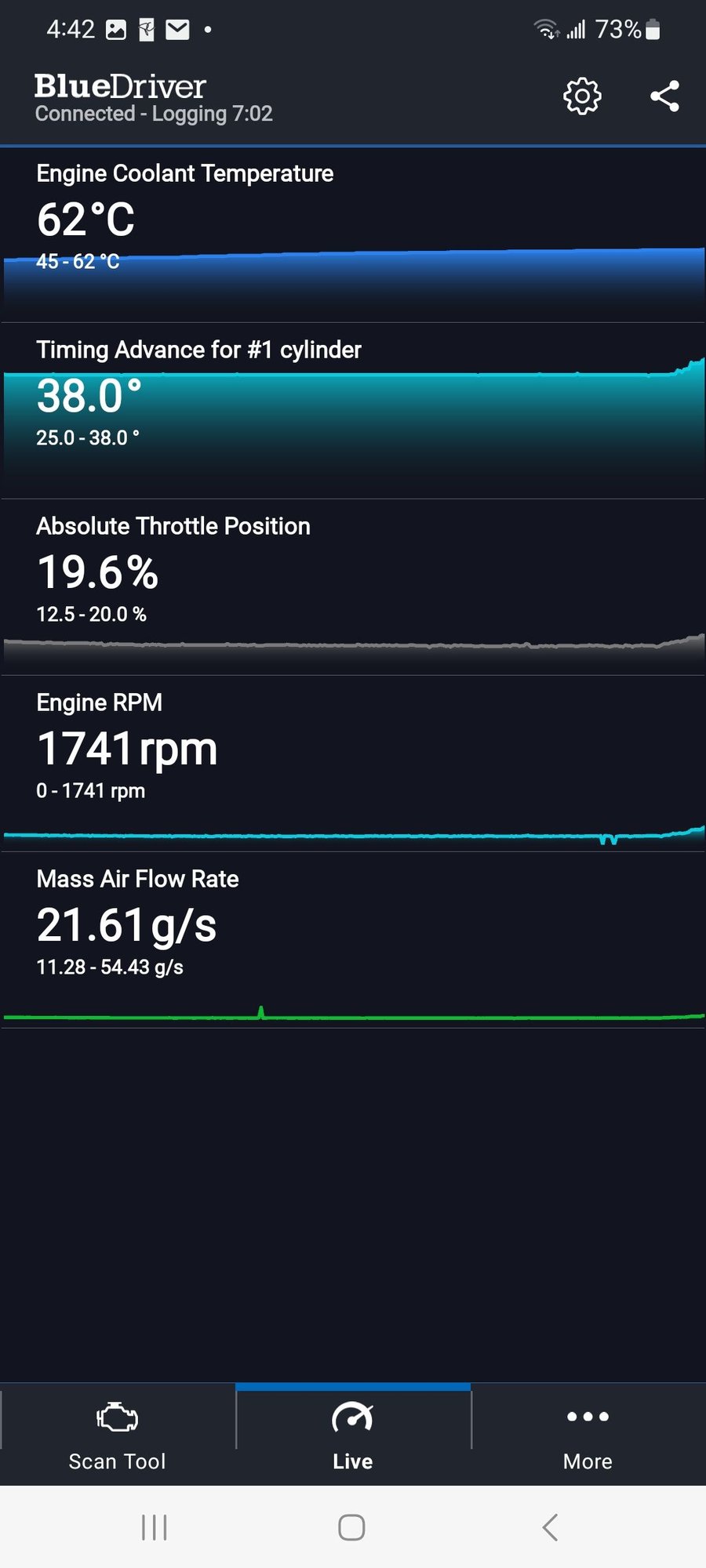 The higher idle and the MAF readings make sense now, along with the higher timing.