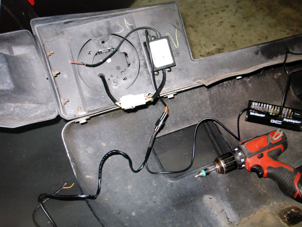 You will need to grind (bench grinder) the mounting tabs to fit the bumper hole so they recess to the back, and the back will have to be opened up (burr Bit and Straight Grinder) just enough to fit the new LED Housing but enough left to screw the lights through the housing tabs, as bad as it looks the stock light could be placed back. not that i ever would. Oh yeah and with the hood open you can drill one hole that you use for a screw driver to adjust the lights. Cut and ready for the new light Tool used, Burring Bit and Straight Grinder all mounted and ready