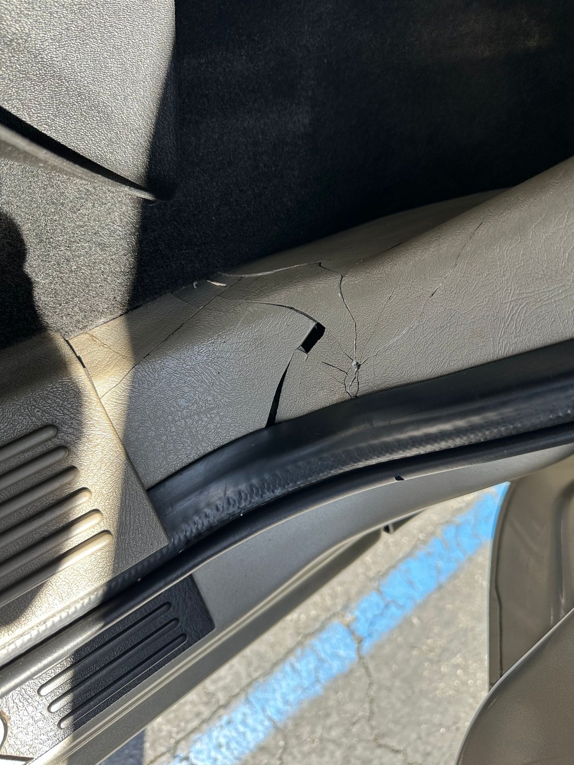 Your bags are ready to fail. Interior trim parts are brittle now, and only available as used at wrecker or eBay. Really hard to find in wheat color, as that color was not popular on later years.