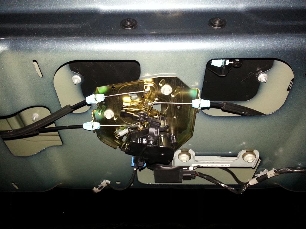 For those whose rear hatch won't unlock, you can pull the plastic surround out enough in the middle to get your arm in and pull the unlock cable, unless you got Schwartzenegger's arms. Lojac's pic is upside down so the unlock cable will be on the bottom right side if you're sitting in the rear cargo area. It's the top-left cable in the pic. The windshied wiper bracket is at the bottom of the pic.