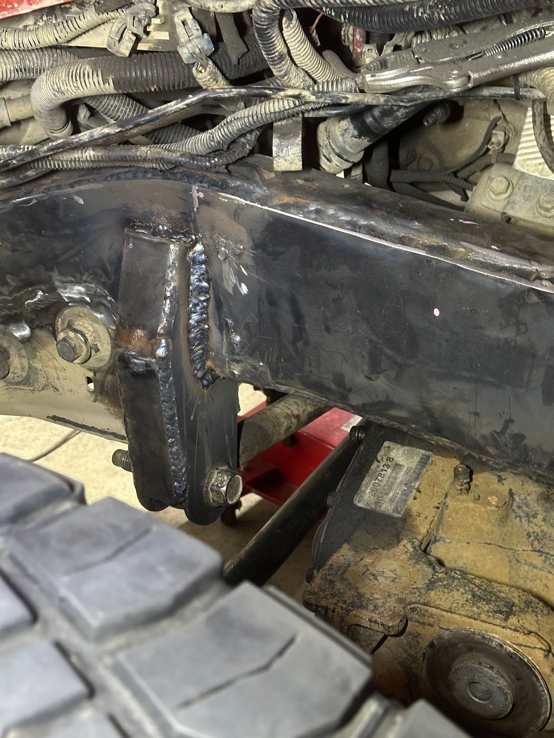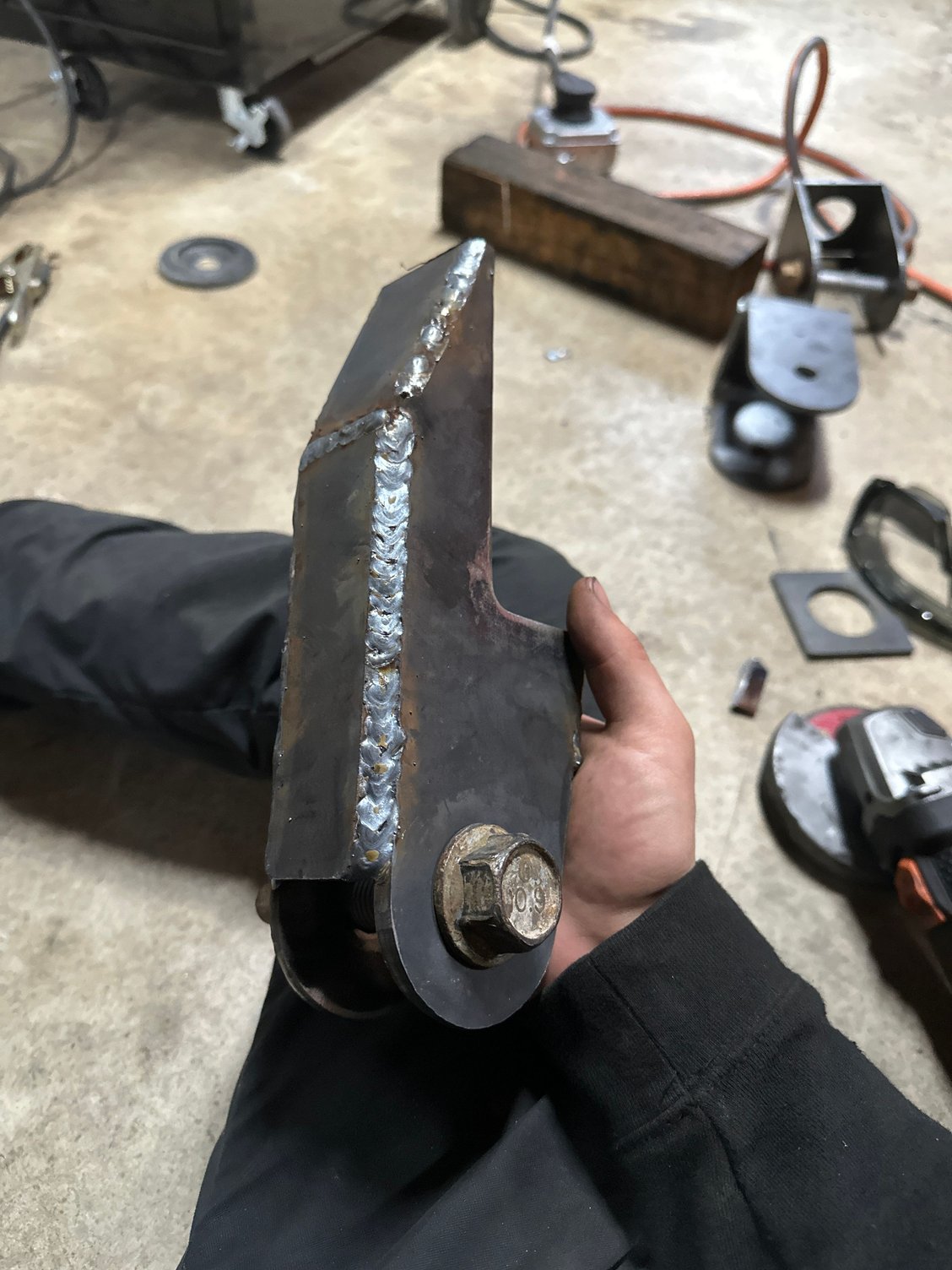 Lastly, I welded on the radius arm mounts and lower support gussets. The radius arm mounts are meant to hold a duraflex 7315 bushing. The lower gussets are super important because the tube is welded toward the back side of the frame plate and has little to stop it from being pushed backwards. Not pictured I also added two vertical top gussets on either side. Probably overkill but I figured it would help against landing on a rock or something.
