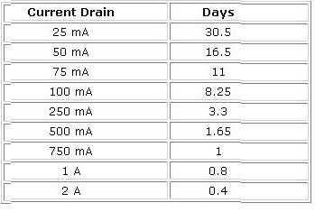 So assuming a parasitic drain of 25mA for the truck, plus 37mA for the little meter, this is 62mA and works out to be around 13 days i.e. about half. Or for just the little voltmeter alone 20 days.