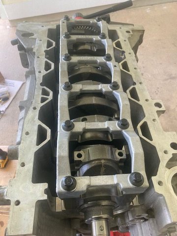 Bottom end completed.  The Main Bearing Brace Bolts are tightened to 18 ft-lbs followed by an additional 180 degrees.  Reference the Schwartz Service Manual for the correct order (also shown in the next picture).