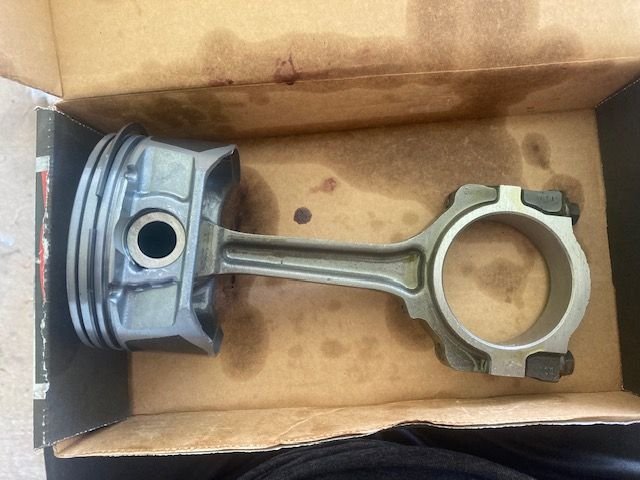 New piston; ensure the valve grooves are on the Exhaust Side of the engine.  I re-emphasize, the small oil control hole on the connecting rods should be facing the exhaust side of the engine as well.