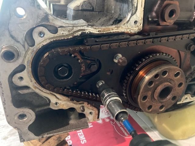 .....then take a rubber mallet and give the crankshaft a few whacks while you are trying to pull the chain off the crankshaft gear. After a few whacks, I was able to break it loose. All of this can be avoided by waiting to remove the bearing brace/caps until AFTER this balance shaft chain is removed.