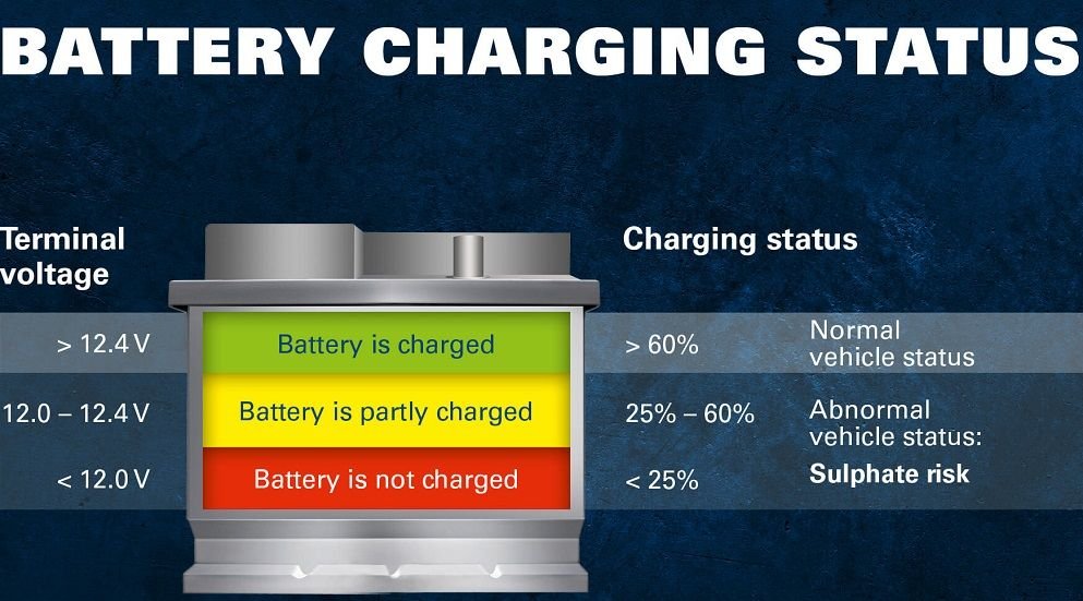 Translation, you should learn yourself on how your vehicle battery works. The charge of a battery is not anything like a gas tank. 12.4-12.6V is charged and will start a vehicle. 12V or less is DEAD. Might turn on the dome light, but you are not going anywhere. Like I said, half full gas tank still has fuel, a battery below 12V is stone dead.