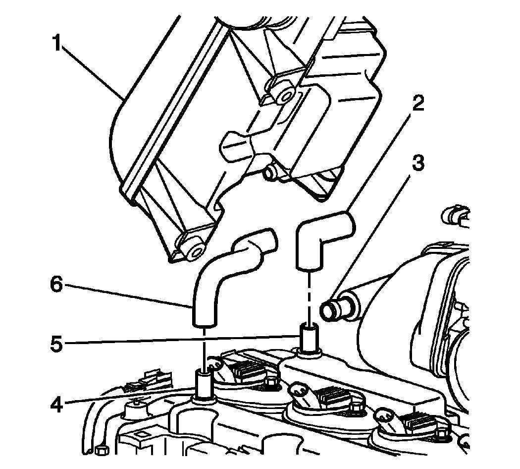 - Test for vacuum at the positive crankcase ventilation (PCV) dirty air hose (2) where it connects to the vacuum orifice tube (5) in the camshaft cover. There should be manifold vacuum present at the hose (2). If there is no vacuum, inspect for a plugged hose, leaking hose or a plugged intake manifold passage.