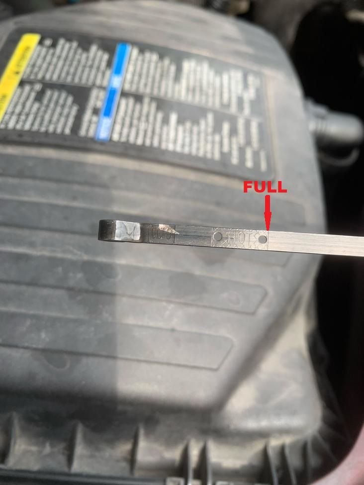 Great, that's an OEM indicator. Again, running @ operating temperature. Pull, wipe, insert, pull again , then check level.