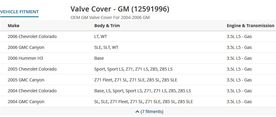 Trying to track down a new valve cover and gasket for my 2006 H3. The original GM part # is 12591996, but apparently its been discontinued. Does anyone know if a 2007 H3 valve cover will work or maybe one for the Colorado?