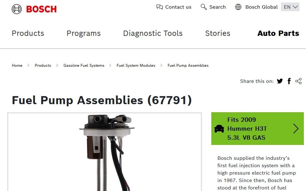 I need help. I cannot find a fuel pump replacement any place that fits my truck. The Bosch was completely wrong. GM discontinued production of fuel pump for the 2009 Hummer H3T Alpha last year. The only aftermarket I could find was Bosch and that was wrong and they said that is the correct part number so they had to remove that from their catalog.