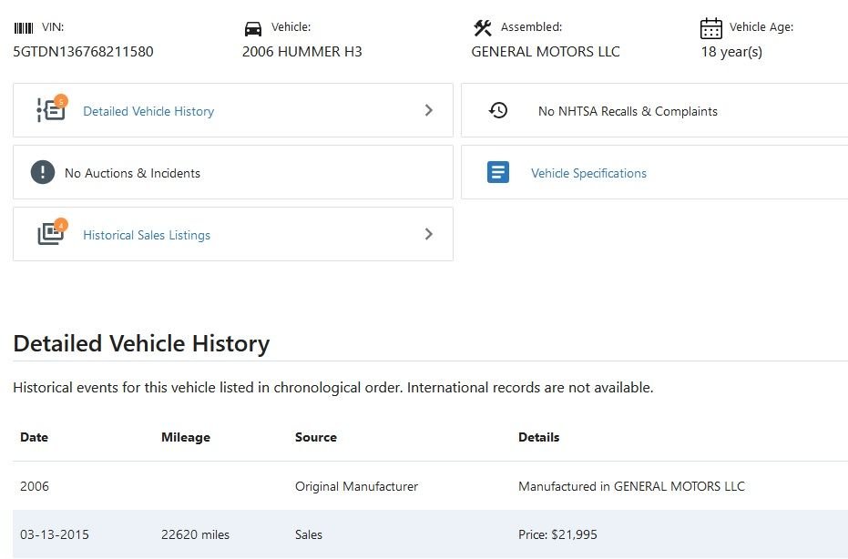 When we bought it, we had to replace the radiator right away. Regular oil changes performed. New brakes, front and back last year. She had a minor accident 3-4 years ago. Nosed out of a parking lot where she was blind to the left, and a mini van caught her. Totaled the mini van. Hard to see any damage on the H3. Got a new bumper, grill, left front fender and light assembly. It threw a code a couple of months back, and we had to replace a sensor and something else. I'm not a mechanic, so forgive my lack of detail. I could find out what it was, if someone wanted to know. It's a solid vehicle, just selling due to 15 mpg killing her pocketbook.