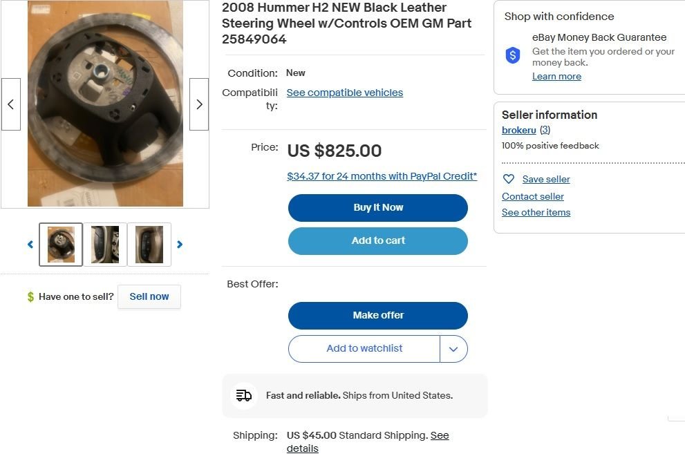 I realize other steering wheels may be used for the H2 but for someone wanting to go back and replace their steering wheel with an original OEM Part and this specific part number25849064 which is the exact same steering wheel that came on many of the 2008 H2, well there are not any GM Parts Dealers that have that currently have this particular steering wheel part number in stock (item discontinued). It is difficult to find and almost impossible to buy that exact steering wheel part number 25849064 from a GM Dealer. I agree one can buy an all leather steering wheel or an Escalade / GMC Denali steering wheel or even a leather with wood finish or even a heated steering wheel but and those steering wheels will be something that fits and/or adjustments may be needed to make it fit, but it won,t be the Original H2 OEM Steering Wheel like the one I that I am selling. And that’s cool, it’s just won’t be the original OEM Part that some H2 purists are looking for.