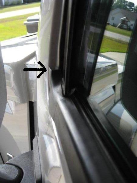 In the second pic the black arrow shows how the outside window trim sticks out if you push the visor out enough for the window to clear the extension. WTF???