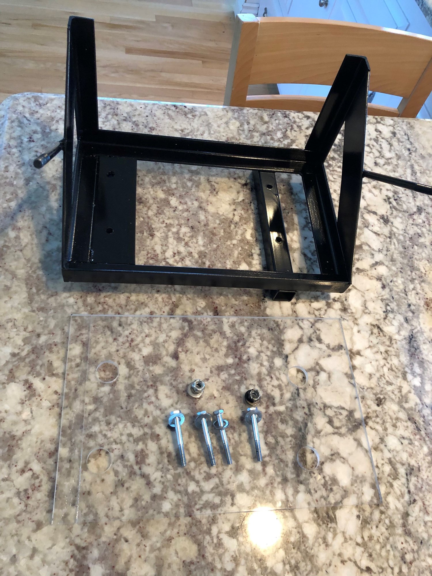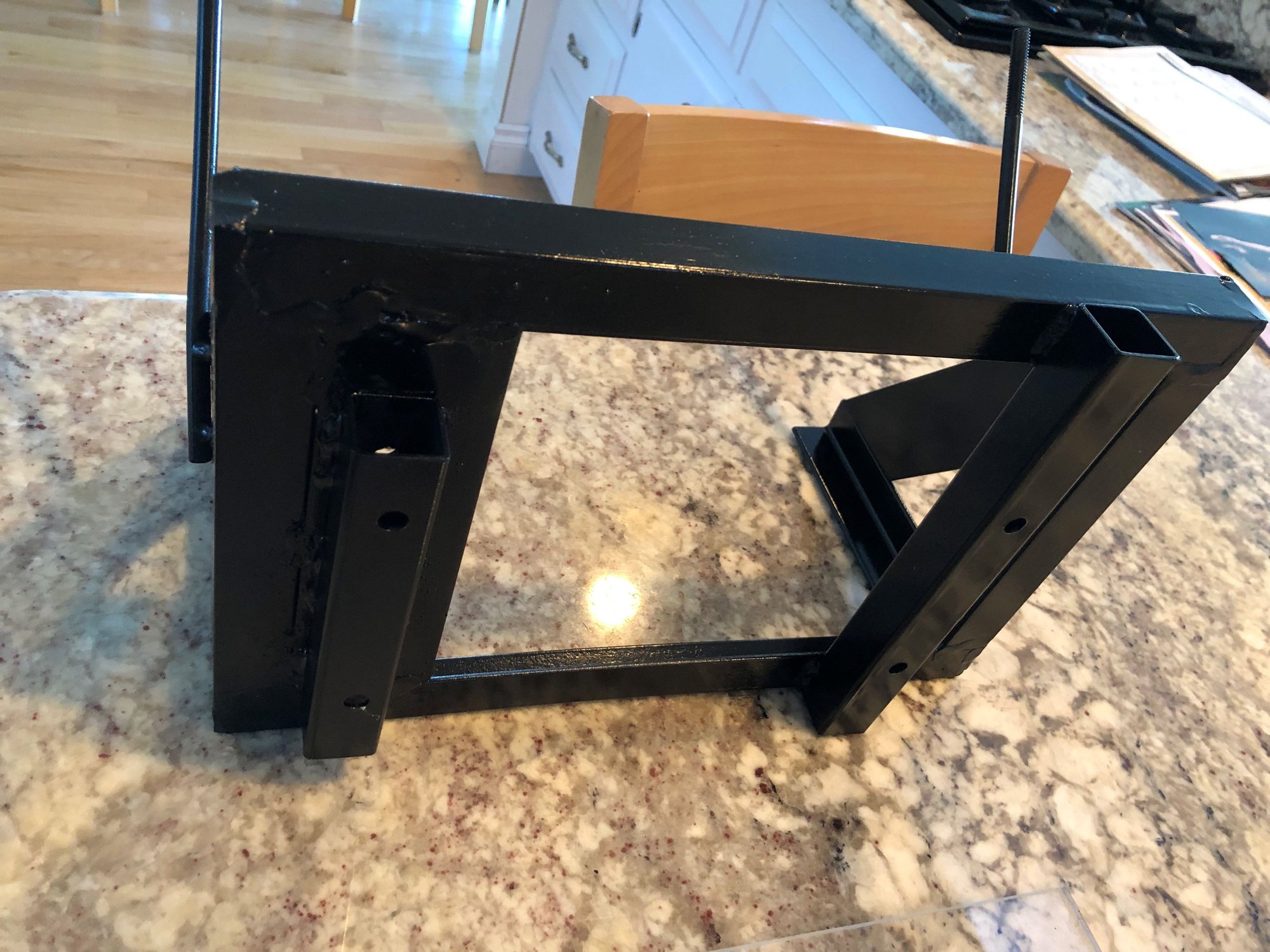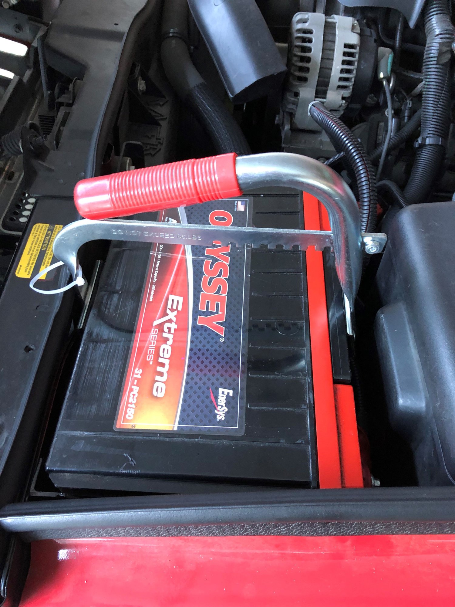 The bottom of the tray needed a 1" square tub to keep the side closest to the drivers from hitting the wheel well. You can see how the square tubing is shorter where the wheel well rises. Used some rods on the tray that are threaded on the end to hold a piece of angle to hold the battery in the tray. Here is the original battery. Note the height and depth. This is the tray installed. The rising wheel well is in the bottom right of the picture. There is a 1/4" piece of acrylic on the bottom of the tray to keep the bolt heads from protruding into the battery. Here is a size comparison of the two batteries. You can see the Odyssey battery is taller and longer but has the same depth. Note the 3/8" screws are removed from the terminals on the Odyssey battery. This enables use of the stock Hummer battery cables. In order to get the battery into the tray you will need a battery carrier to load it on it's side. The largest carrier was a little short but I was able to bend it a little to make it work for the 8.75" battery depth (which is really the height). The battery weighs 80 lbs so this was a critical tool to install the battery. Here you can see the battery installation complete. The battery cables are screwed into the terminals similar to the stock battery. the area is a little tighter but it all works.