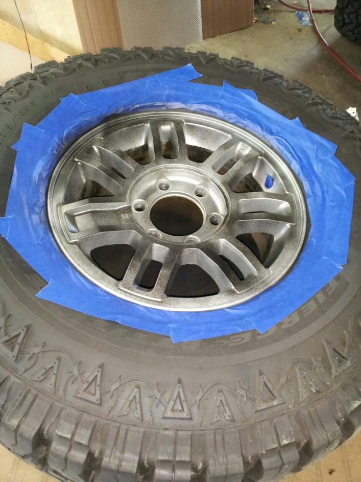 can't really say exactly how long the wheels took, I was changing brake pads in between spraying the wheels. I put four coats on each wheel, the hardest part was lifting the heavy beasts onto my work table. the first one I did not mask off the tire and while you can peel off the overspray from the tire I found it to be a pain because it woul tear at every molded letter or line in the sidewall, the rest I masked off and I recommend doing that.