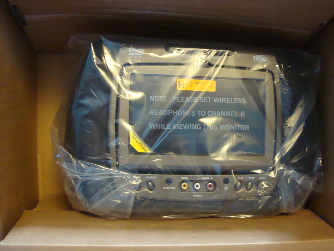 For sale a brand new in the box GM dual headrest DVD player system. Everything is brand new, only opened to take pics and make sure all parts were accounted for. Includes Two 7" color TFT-LCD monitors w/ top loading DVD/CD/MP3 players pre-assembled into factory headrest, 2 wireless headphones, 1 remote, electrical harness and wireless FM modulation, headrest are cloth material ebony in color with red stitching. Paypal only and shipping is included to anywhere in the Continental US.