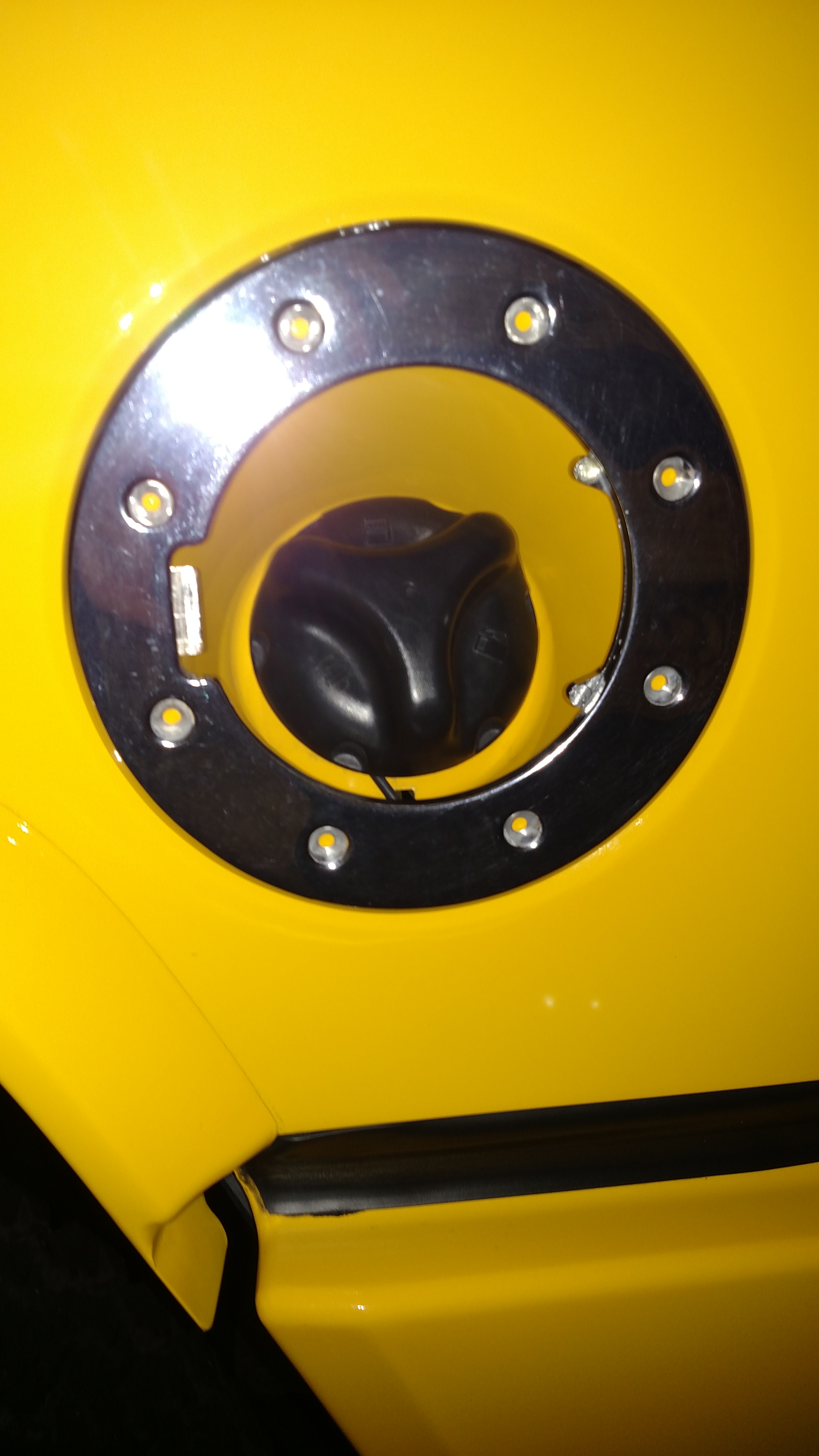 Hello. I'm new to the site. Any help is greatly appreciated! I just bought a 2006 H2. It has an aftermarket locking Billet fuel door. I'm wanting to remove it and replace with the OEM chrome Hummer fuel door. Problem is I can't figure out how it's attached. It's been installed with the black factory plastic fuel pocket removed. I have removed all the exterior bolts( just superficial around the ring) and have also removed the fuel door. The only thing left is the chrome circular ring. It's still attached tight but no other screws are visible holding it on. Please look at attached photos. Thanks for any help!!!