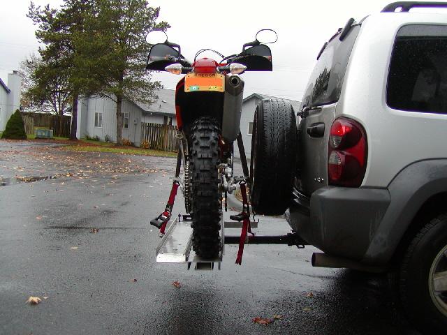 i cart a full size dirtbike on the back of my h3 using a hitch hauler. i ratchet strap the bars down and then i strap around the chassis on the bike right to the spare tire, going through the spare/wheel itself. cut a piece off an old radiator hose and put it over the peg closest to the truck because when pulled up tight to the spare, the peg will gouge the aluminum wheel and could cause damage to the bead area.