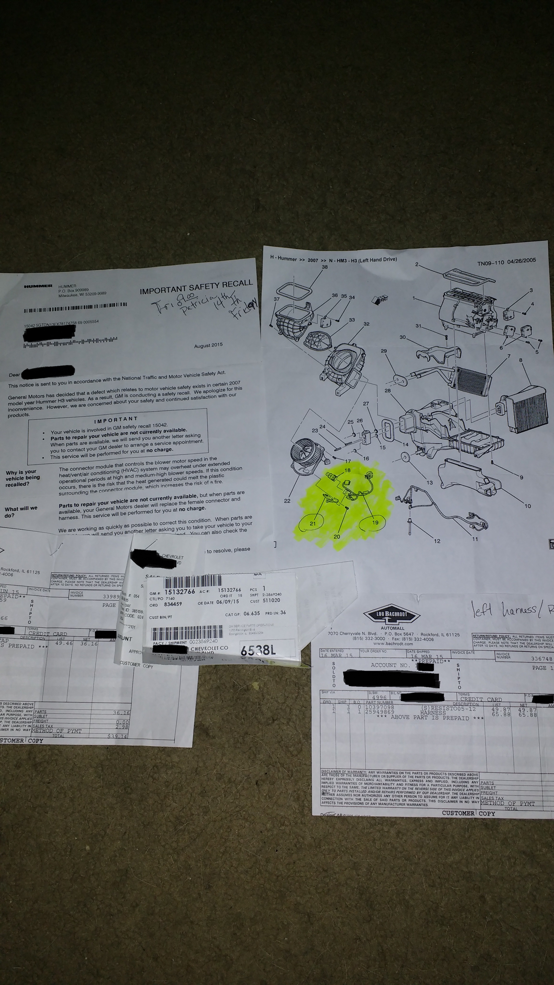 Oh, I apologize, it happened in March of 2015, also I'd like to include that I used incorrect vernacular in my description. The highlighted **** is what caught on fire, I had to then use a fire extinguisher, made by a non-General Motors company to put the fire out. Followed immediately by removal of the GM glove box door, and separate glove box compartment using my hand at first, then later after calming down from the initial shock of my truck catching on fire I proceed to remove the left over pieces that were not broken in my foolish haste of saving my damn truck, with a screwdriver. I then, cut out the burned and charred harness. I was able to figure out how to solder in new connectors, and add the new harness part number 25949869, and a resistor (not a relay as I originally wrongly informed everyone), part number 10397098. also highlighted in the picture. The recall notice I received was in August of last year. I certainly do apologize for not having the correct dates for you as well in my original post.