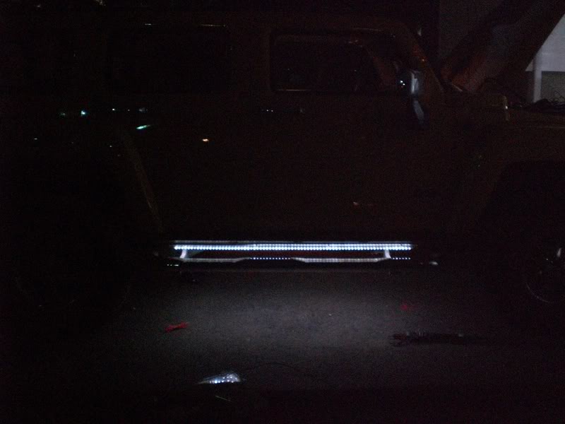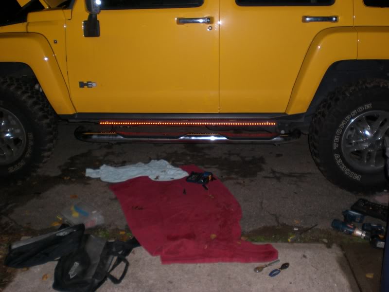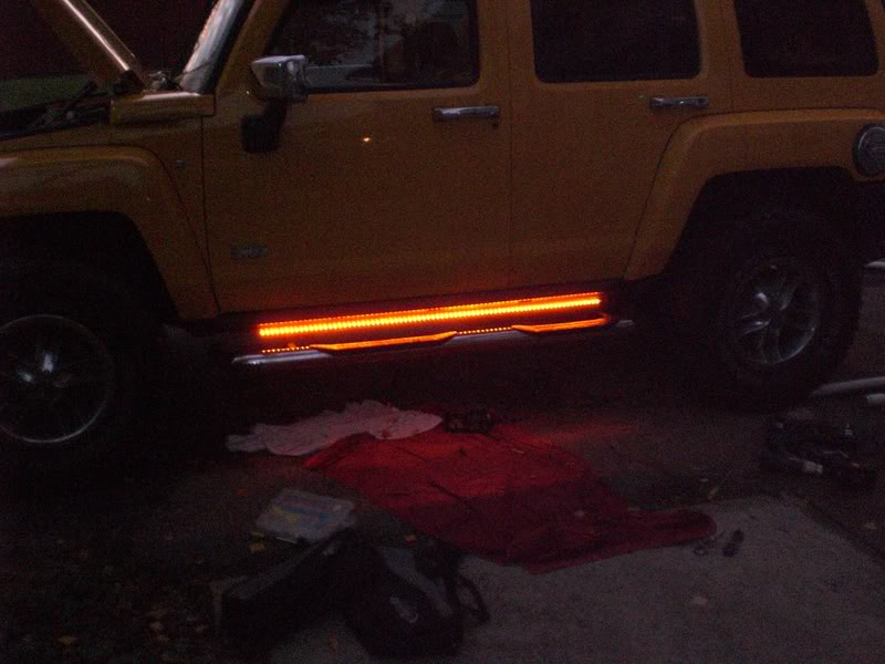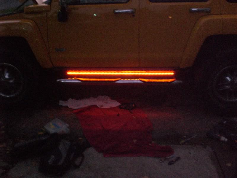 Attachment 21087 now that thats off I had to make some new brackets to hang the light bar right below the pinch-weld, mounting onto the pinc-weld just isn't possible. Here is what it looked like after mounting: Attachment 21088 Once that was done all that was left was to wire it up and reinstall the rocker covering. There are 3 wires, orange- positive that I tapped into my HID headlight relay so they turn on when the headlights are on....White- positive to the door switch so that the Lightbar lights up white when the door is open....black-ground. I don't have a pic of the white lights on yet...I kinda forgot but here is how they look when the headlights are hooked up. I am surprised....they look AWESOME!!! With Flash.... Attachment 21089 Without Flash...they are BRIGHT!! Attachment 21090 Attachment 21091 Overall I like em...harder install than I was expecting, but nothing on the h3 is easy anyway:DI know it mounts below the pinch-weld so it may be at risk when wheeling...but it also mounts above the side step bar bracket and above the frame so it's somewhat protected.. I have a few more products to install...I'll make new posts as I get them installed. |