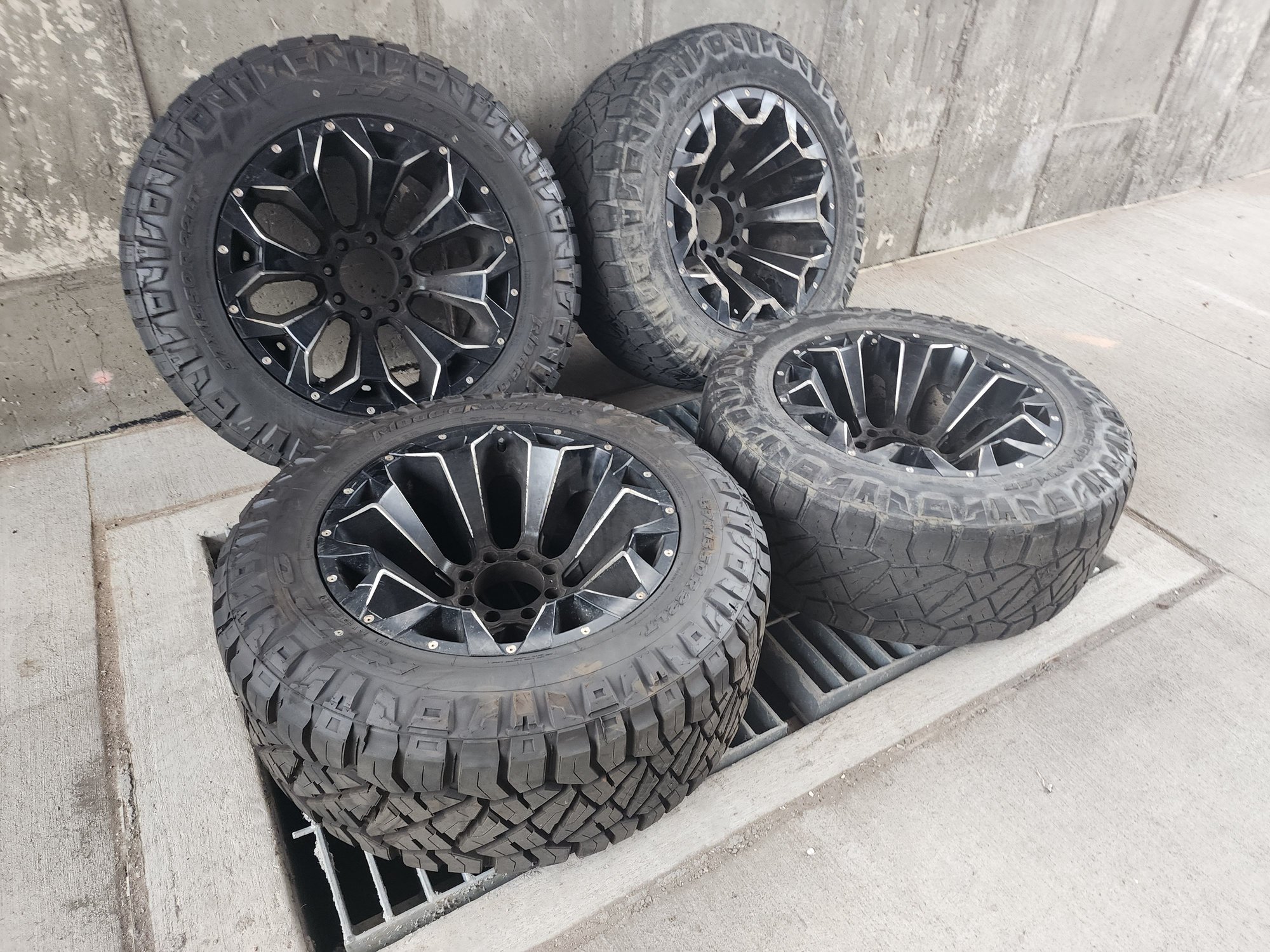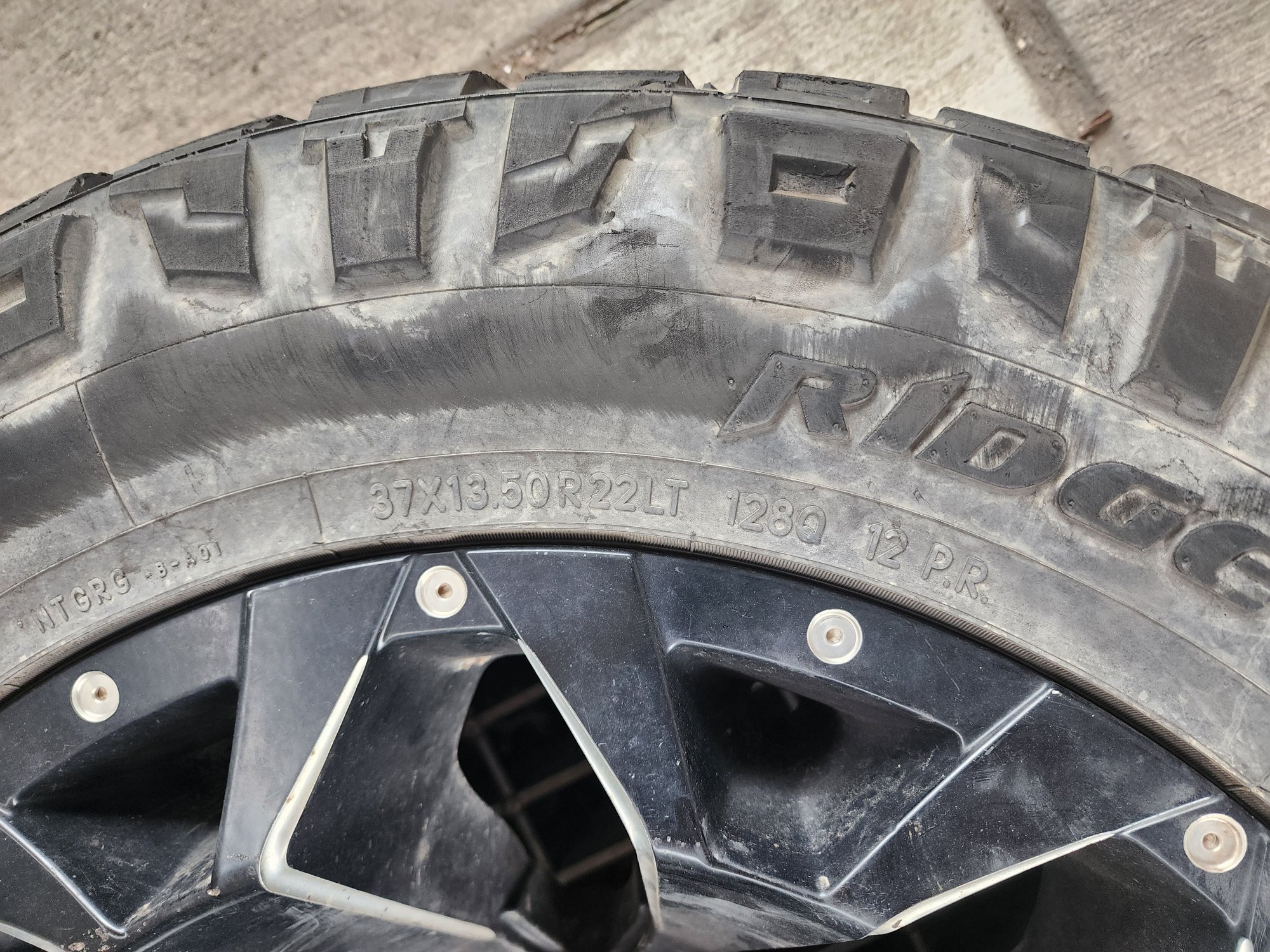 Two of the tires are brand new, the other two have about half life left on them. The size for these are 37x13.50Rx22LT Load Range F. These tires are $1200 new, willing to trade for a Truck or a Van. The bolt pattern is 8x165.1 These will fit the following trucks:GMC: Sierra 2500 hd, Sierra 3500 HD Savannah 2500 Savana 3500 Yukon XL 2500 suburban 2500Nissan: NV 3500 NV 1500 NV 2500Hummer: H1 H2Chevrolet: Express 2500 Silverado 3500 HD avalanche 2500 Silverado 1500 hd Silverado 1500 HD classic Silverado 2500 Silverado 2500 hd Silverado 2500 HD classic Silverado 3500 Silverado 3500 classic c20c2500 c 2500 suburban c30 c3500 g30 K20 k 2500 k2500 suburban k3500 v2500 suburban Express 3500 Express cargo Express pasajerosFord: F-250 F-350 e-150 Econoline e250 Econoline E350e-150 Econoline e250 Econoline E350 EconolineRam: Ram 2500 Ram 3500Holden: suburbanDongfeng: MingshiMercedes-Benz: g class