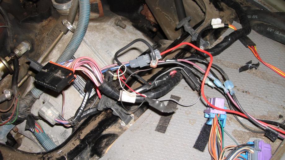 I have a 95 6.5 NA. I started having issues with the tranny. It first would not go into overdrive and then quit shifting and is stuck in 1st. I got the main connector off of the transmission and connected a voltmeter to see if I get power when the key is on and engine is off. I got 0 volts. I checked all fuses and they were good. I then removed the dog house to access the wires and what I saw is a mess of wires. See images below. I then connected one lead to pin E on the tranny connector and then guessed which pin in the harness it would be by the doghouse. Does anyone know what pin from the computer supplies power to the tranny? Does anyone have a wiring diagram? Any help would be appreciated. Are the mess of wires standard? Can anyone identify some of the items in the photos?