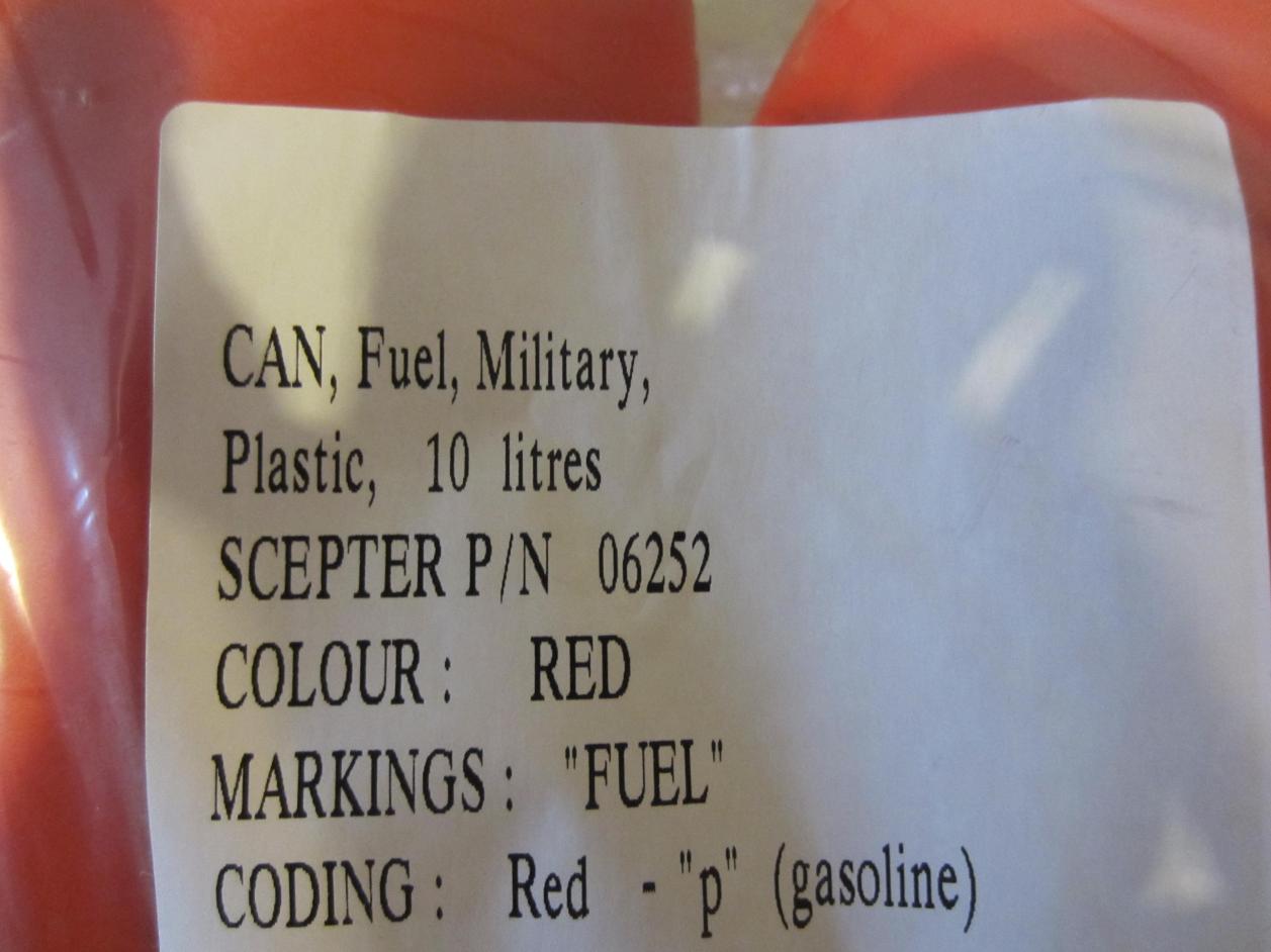 Sold out! No more left to sell. Thanks..... "Discontinued" well over 5 years ago these are pre CARB ban cans they cannot be seized and you can't receive fines for being non carb compliant! These colored SCEPTER jerries were hard to find in rare RED then. Nowdays almost impossible! None of these have ever had fuel in them, some are still in the factory shrink wrap and have factory viton seal in the cap neccesary for safe storeage of gasoline. These mfc's are the exact cans used by the U.S.A. , Canadian, Israeli as well as some other military worldwide.(but they do not say property of any government agency) Were made right where I live canada. Buyer pays actual shipping cost. These are called GI Runts. Very tough, can be run over and still used, shot at does not explode. Built to Mill-Spec. Very easy to pour and handle or lift overhead when full for roof rack mounting aprox 20lbs. Spouts A.K.A. Donkey Dicks are available at addiitional $40 two styles to choose from 3/4" clear tube or 1 1/8" black flex tube (spouts are only sold with fuel can purchase.)These are pefect item to have in that emergency storm type situation for you, or to help out someone else in need. I would not go off roading without some spare water and fuel, and several other neccesaties. PM if interested. Thanks !