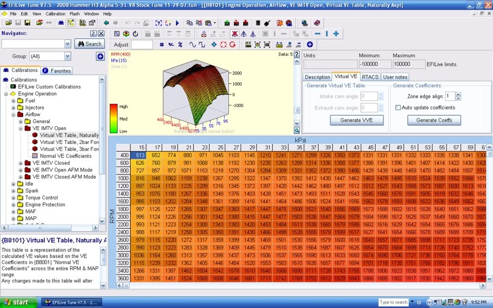 I upgraded my EFILive V1 license to the V2 version with the new handheld controller. As I mentioned in a previous post,the new software incorporates a virtual VE table to compensate for the VE coefficients which were a pain to work with in previous versions. The VE table can be modified just like other ECM VE tables (like in myE38 vettes) and EFILive calculates the new coefficients. This means that, basically,the same techniques used to tuneearlier PCM's(like the E38)should apply to the E67.
