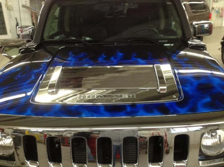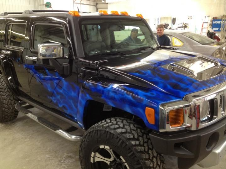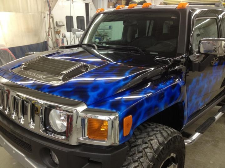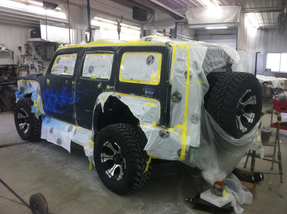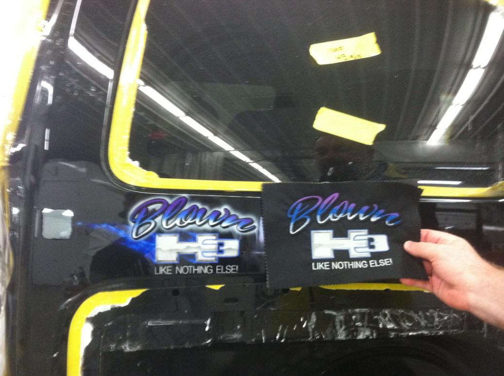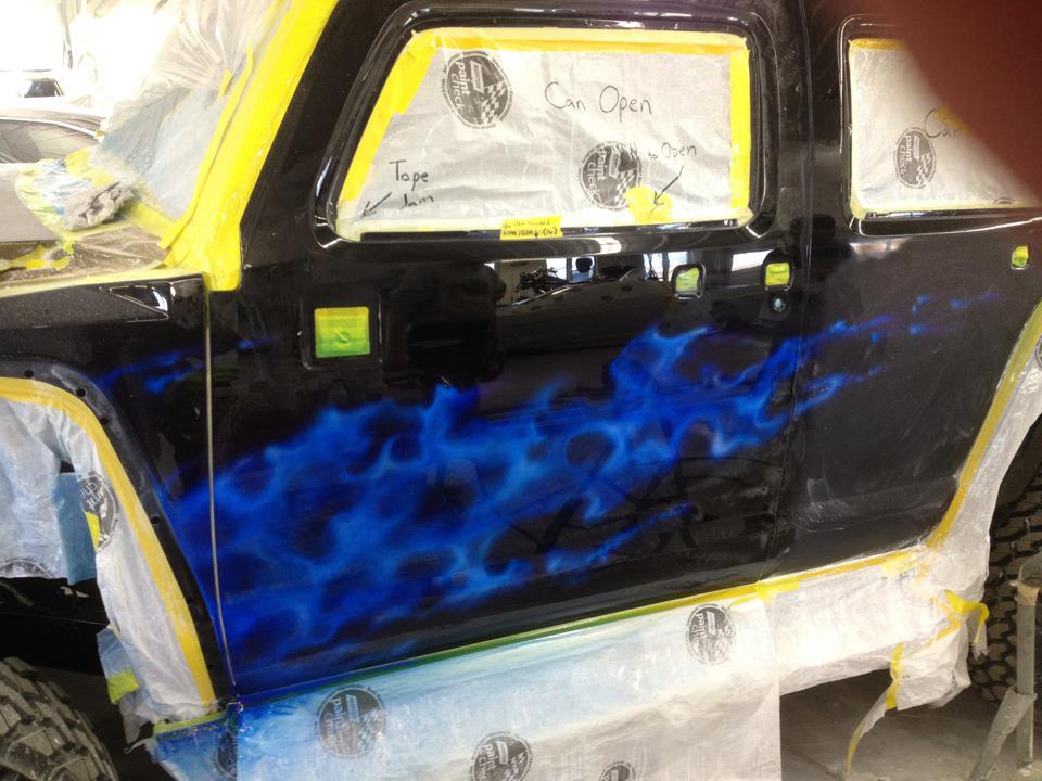 I have attached a couple iPhone pics I took today. Clear coats with candy have all been applied and the sanding is pretty much complete. I also attached a pic of me holding the sample embroidery for the headrests next to the graphic on the right rear 1/4 panel.