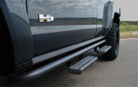 I like the way the H1 factory bars work the best, pull two pins and slide them off for trail use. This would have been a great design for the factory H3 nerf bars too.