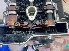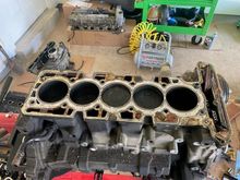 Head off, broken studs removed. First glance, lot of carbon build up in the pistons.